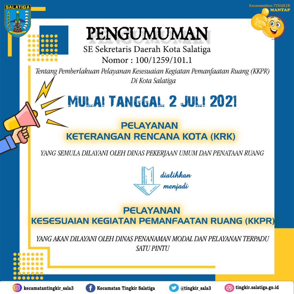 30/06/2021 tingkir Pemberlakukan Pelayanan Kesesuaian Kegiatan Pemanfaatan Ruang (KKPR) Spread the love Pelayanan informasi KRK pindah ke Mal Pelayananan Publik (MPP) nggih, sobat.. 685 total views, 1 views todaySharing is caring